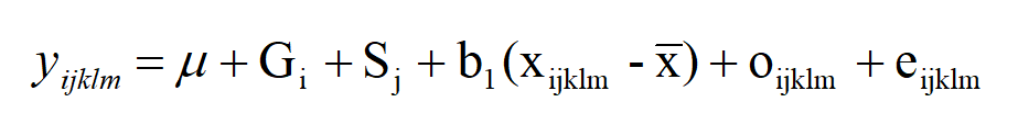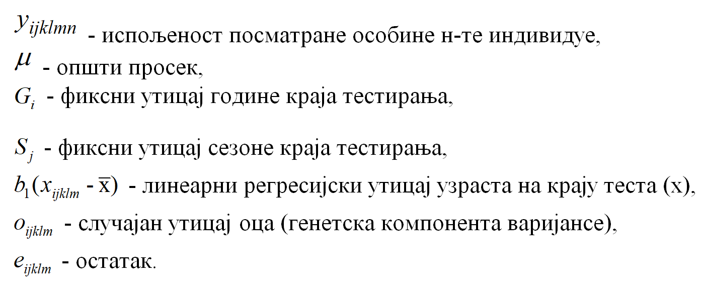 Фенотипски и генетски параметри неопходни за конструкцију селекцијског индекса утврђени су применом метода најманјих квадрата у програмском пакету ЛСМЛМW - Харвеy. За анализу је коришћен мешовити модел који се у скаларној нотацији може приказати на следећи начин: