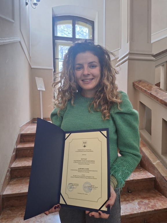 Priznanje joj je dodeljeno za naučni rad pod nazivom „The Effect of Green Extraction Technologies on the Chemical Composition of Medicinal Chaga Mushroom Extracts“.
